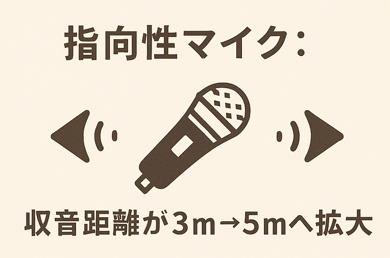 - 指向性マイク:収音距離が3m → 5mへ拡大